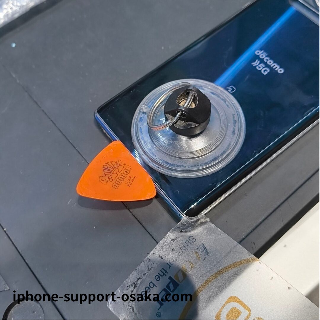 AQUOS R6 は背面から開くタイプです。背面はプラスチック製なので割れる心配は少ないですが、トランプなどの薄いカードを差し込んで丁寧に外します。