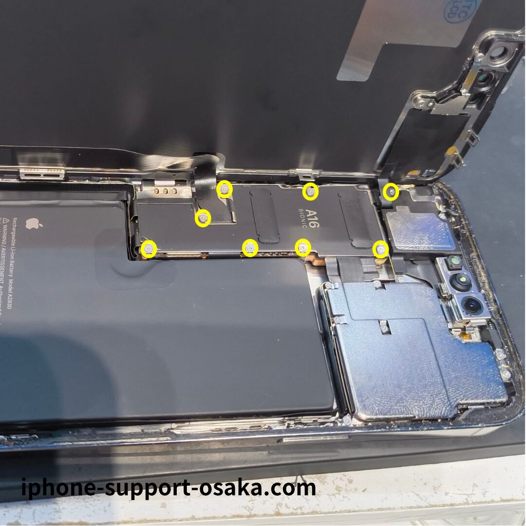 続いて、すべてのコネクターを固定しているプレートを留めているY字ネジ8本を外し、バッテリーとディスプレイケーブルを丁寧に取り外します。