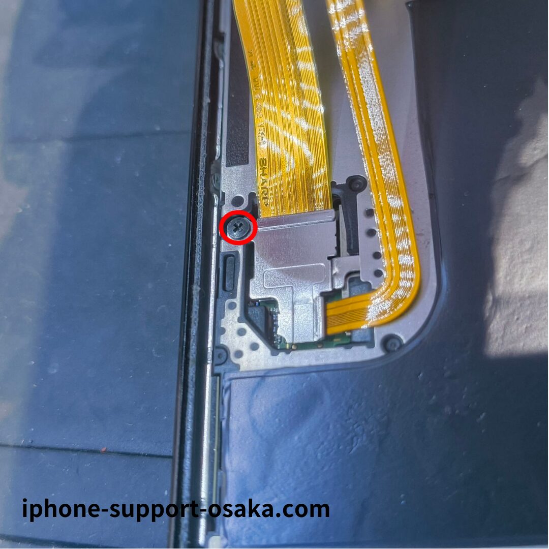画面が外れた後は、バッテリー、画面、指紋センサーの三つのケーブルを固定しているプラスネジを外し、プレートを取り外してケーブルを順番に外します。