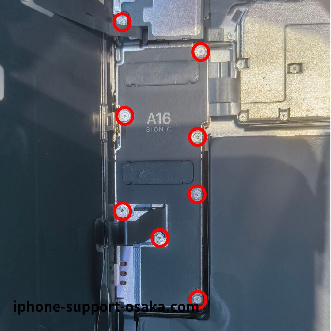 画面ケーブルを固定しているプレートのY字ネジ8本を外してプレートを外します。