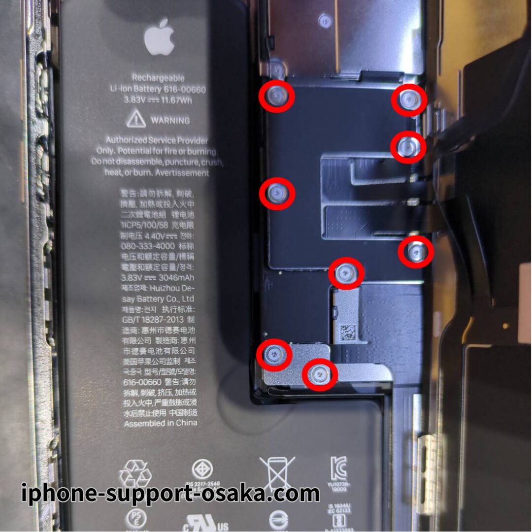 まず、バッテリーと画面のコネクターを固定している2枚のプレートを外します。バッテリープレートのYネジ2本を外してプレートを取り外し、コネクターを外します。次に画面プレートのYネジ6本を外し、プレートを取ってから画面側のコネクターを外します。