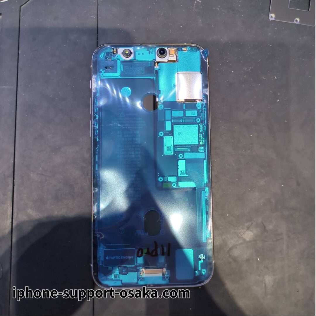 iPhone 11 Pro は画面側から開ける機種です。熱とピックを使い、丁寧に画面を外します。