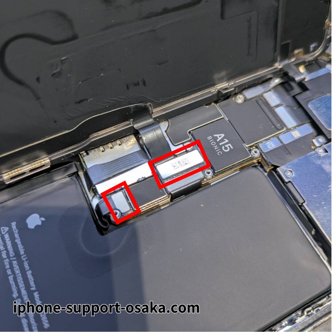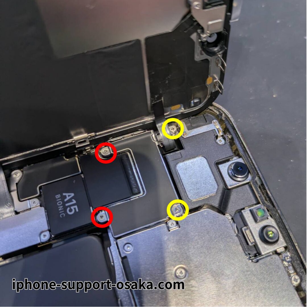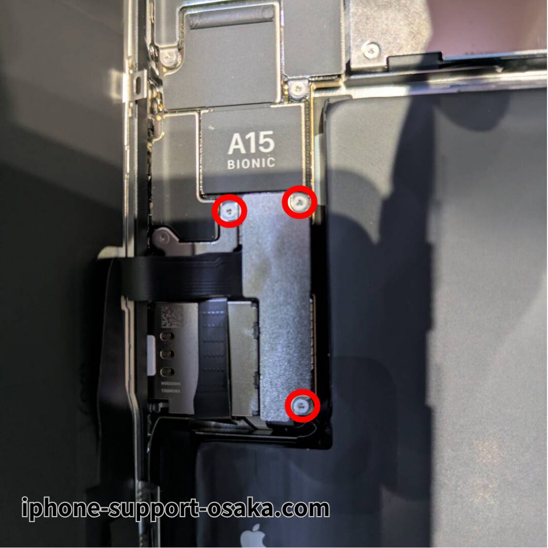 最後に、古い画面裏側に取り付けられているフロントセンサーを固定している Y字ネジ3本を外します。