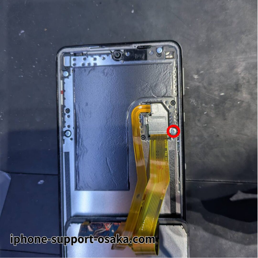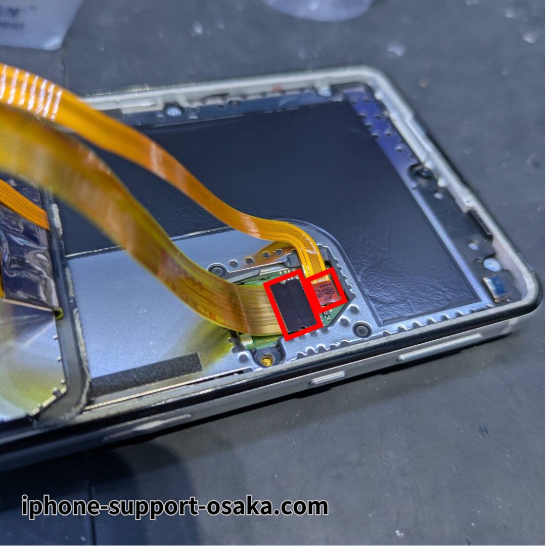 ネジとプレートを外した後、画面と指紋センサーのケーブルを取り外し、画面は安全な場所で保管します。