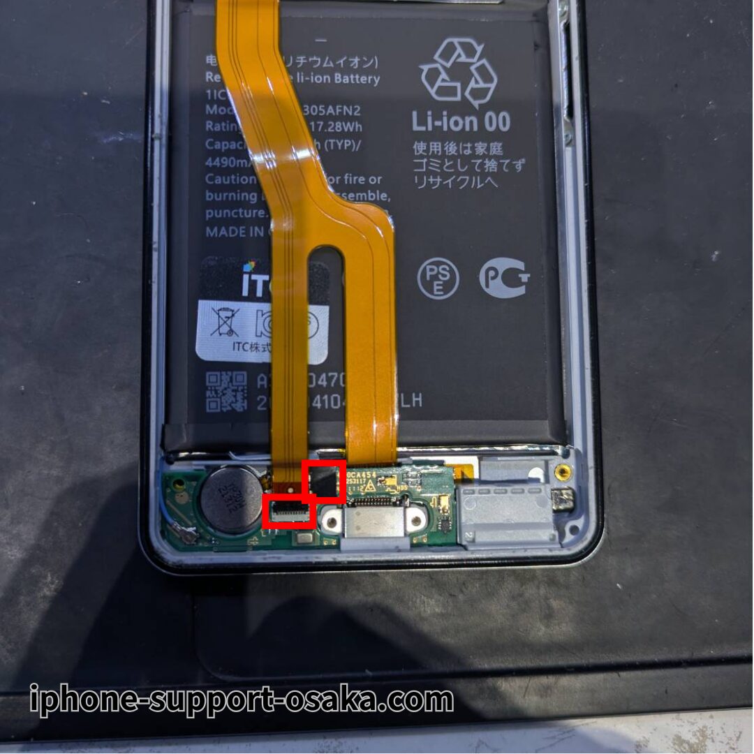 下部基板の左側に接続されているケーブルのラッチを開き、ケーブルを外します。続いて、下部基板を固定しているテープを剥がし、基板を取り外します。最後に充電口部分を持ち上げ、ケーブルを外します。